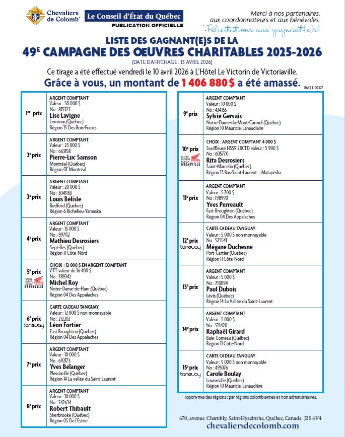 À la demande du Grand Chevalier Langis Proulx, vous êtes par la présente convoqués à l’assemblée mensuelle qui se tiendra le jeudi 23 avril 2026 à 19h00, à la salle du Conseil 2843, sise au 139 St-Germain Est; votre présence serait grandement appréciée à cette mensuelle.