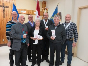 1 ère rangée : Langis Proulx Député District, Jacques Breton Grand Chevalier, Adrian W. Proulx Ex-Grand Chevalier, Dr Gilles Ouellet Médecin.